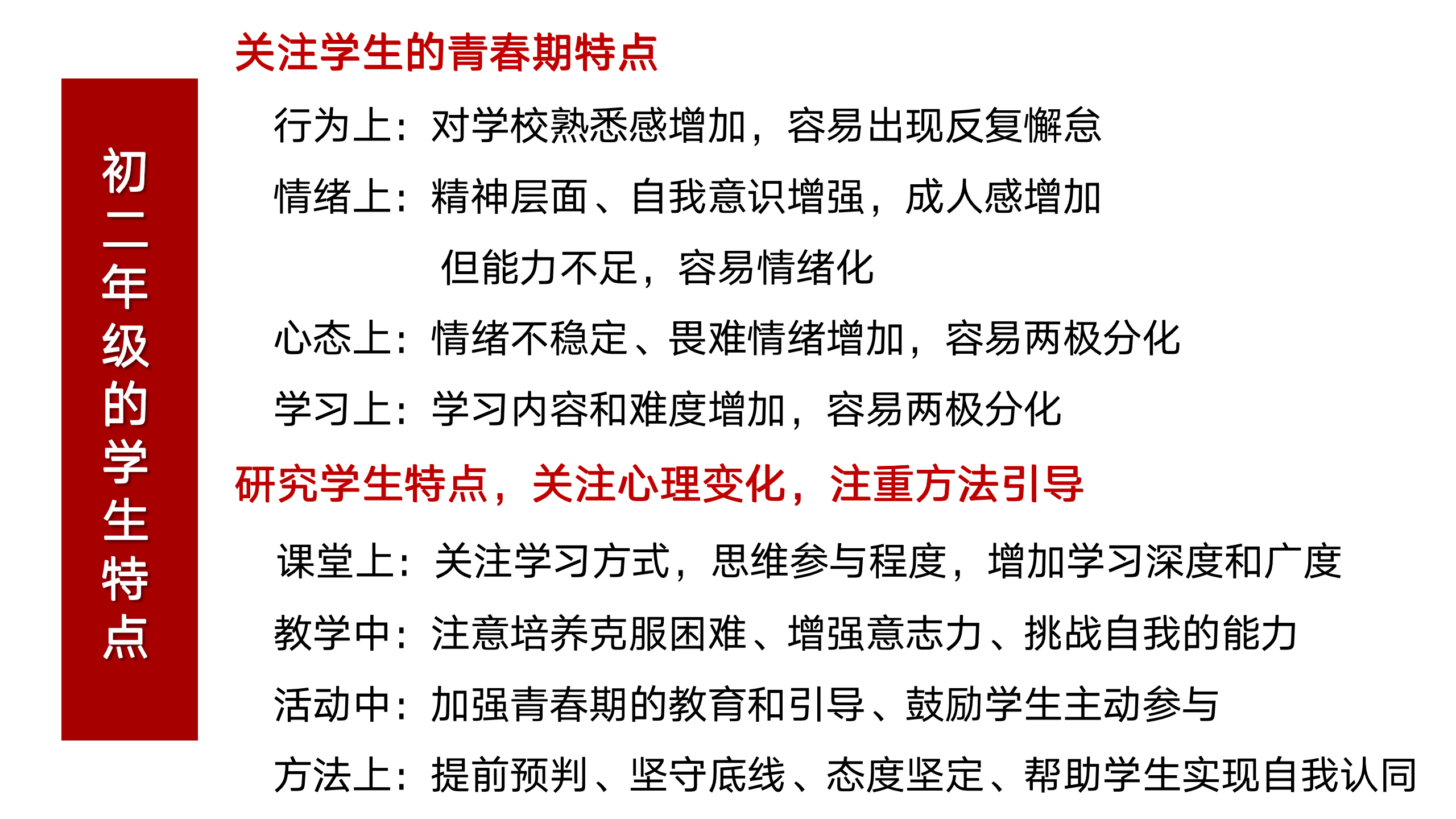 武老师从青春期的变化开始,以“变‘敏感期’为‘提升期’,关注学生成长体验和细节”为主题介绍了初二年级开学以来的新举措、新气象。