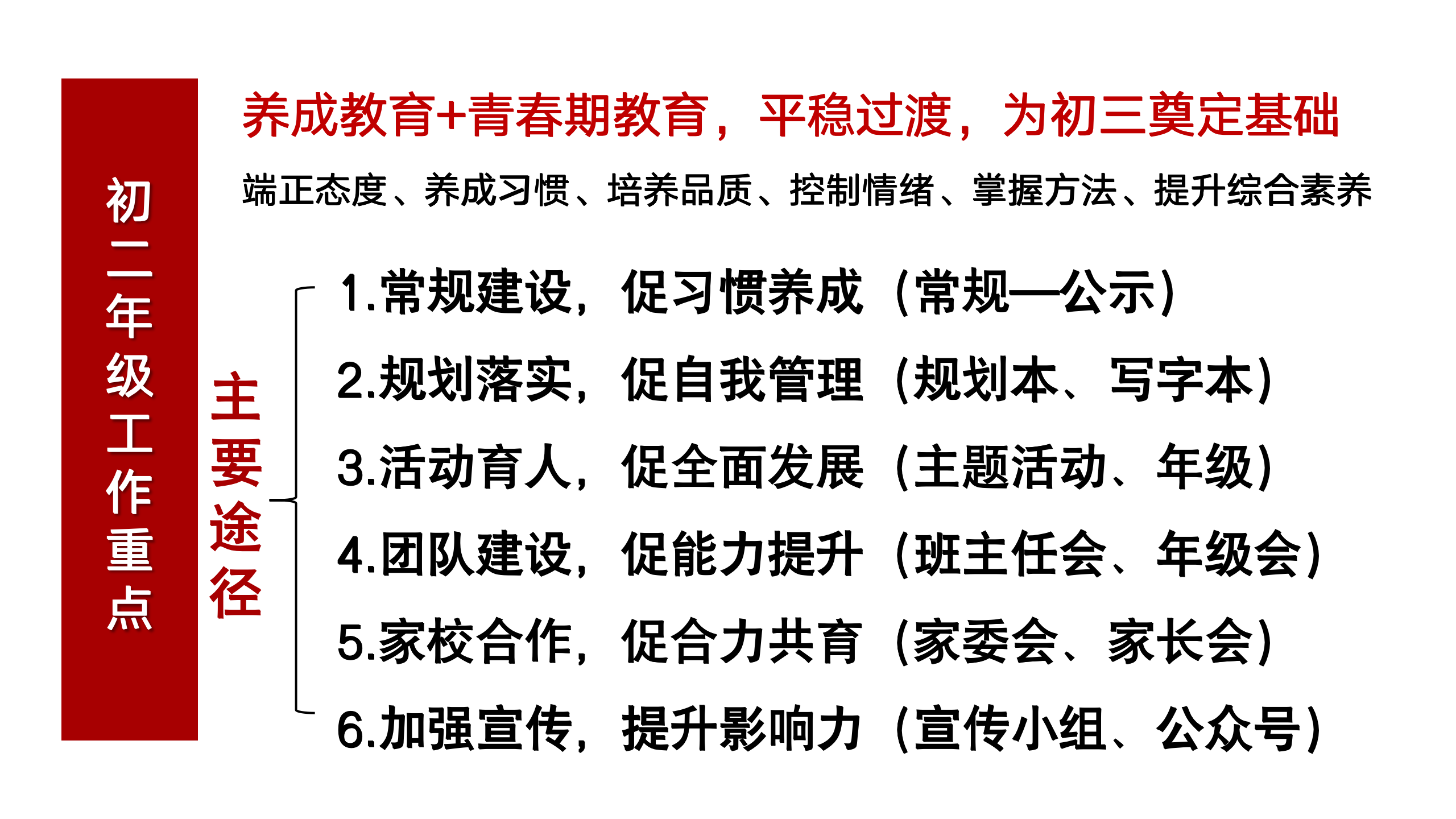 武老师指出,初二年级正处于心理学家口中的“心理断乳期”,这一阶段的学生较为敏感。因此,在初一开展的养成教育的基础上,老师们通过不断研究学生青春期特点,关注学生情绪变化,引导学生通过端正态度、养成习惯、掌握方法、控制情绪、培养品质等多种途径,来提升学生综合素养,实现平稳过渡,为初三奠定基础。