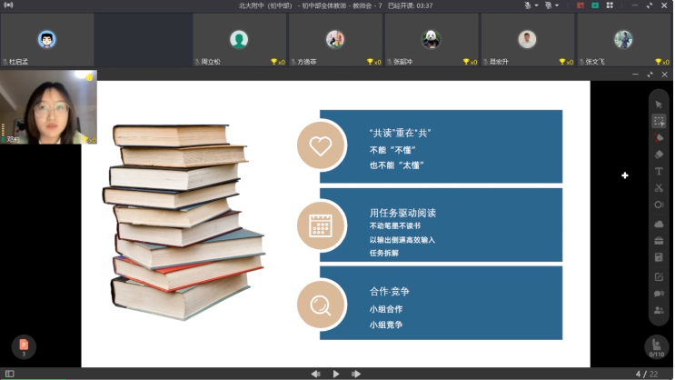 1月12日下午,邓莉老师、刘滢老师、王丽娟老师分别就“师生共读一本书活动”做了自身课堂总结和经验分享,书目经典,课堂实践内容丰富。
