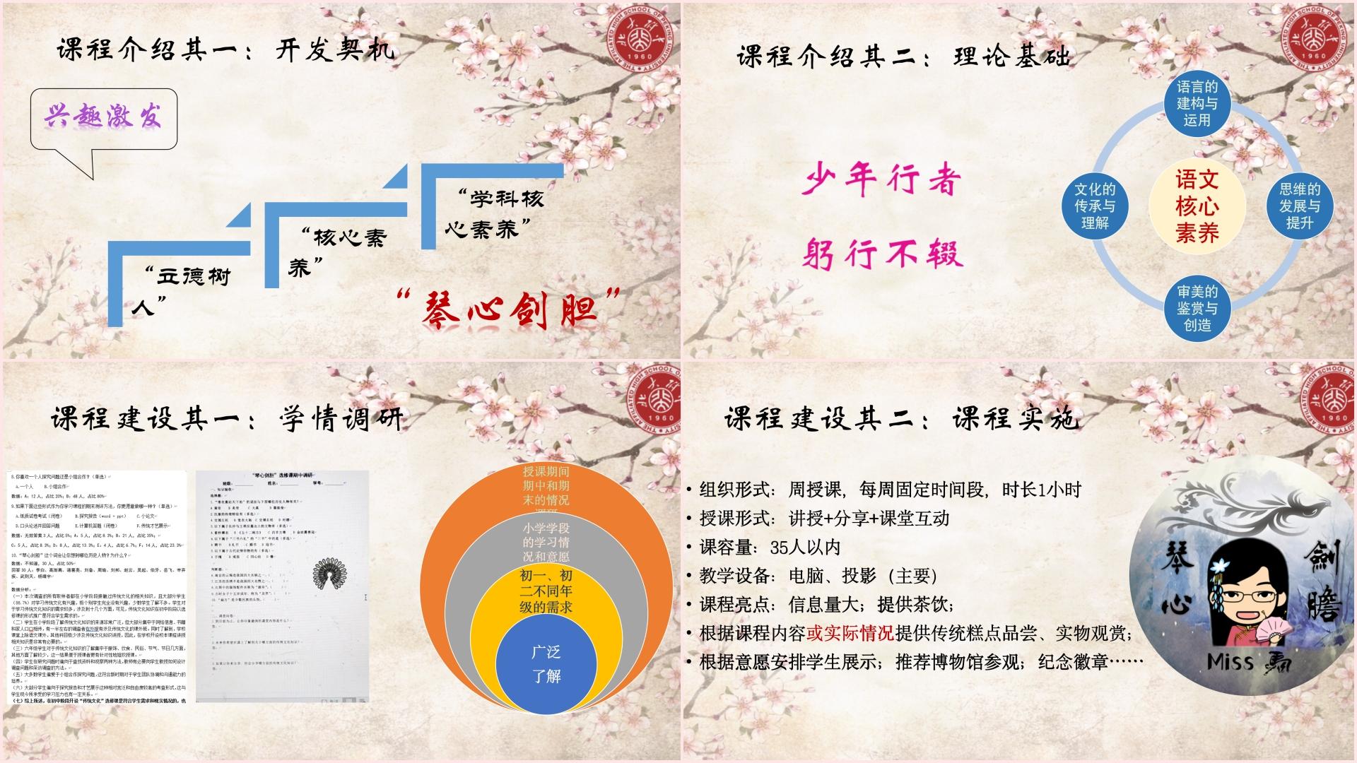 马玉婷老师从课程介绍、课程开发与建设、课程小结与改进、感想致谢四个方面展开探讨,马老师以自身对传统文化浓厚的兴趣做为课程开发的契机,以多方面理论基础为支撑,进行学情调研,设立选修课。通过生动丰富的课程设计和丰富的实践活动,希望学生通过了解传统文化,增强民族自豪感和文化自信心,同时辅助语文学科学习。