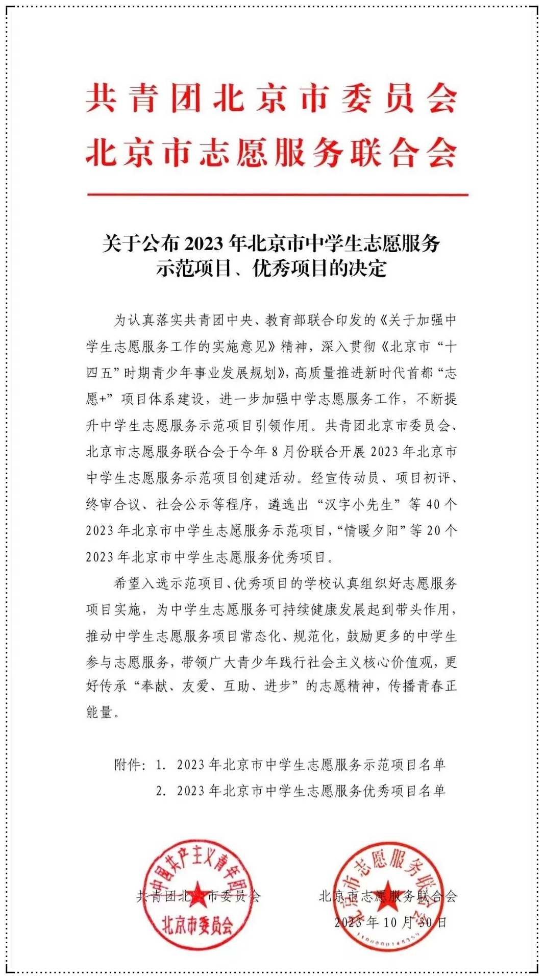2023年北京市中学生志愿服务示范项目名单