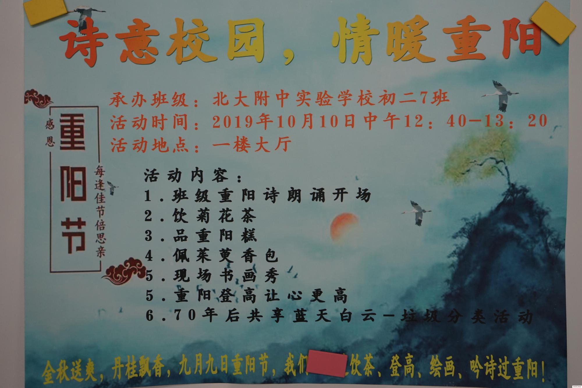 2019年10月10日,初一七班承办了北大附中实验学校重阳节主题活动。在活动中,我校各年级同学可谓是增长了知识,了解了更多传统文化。