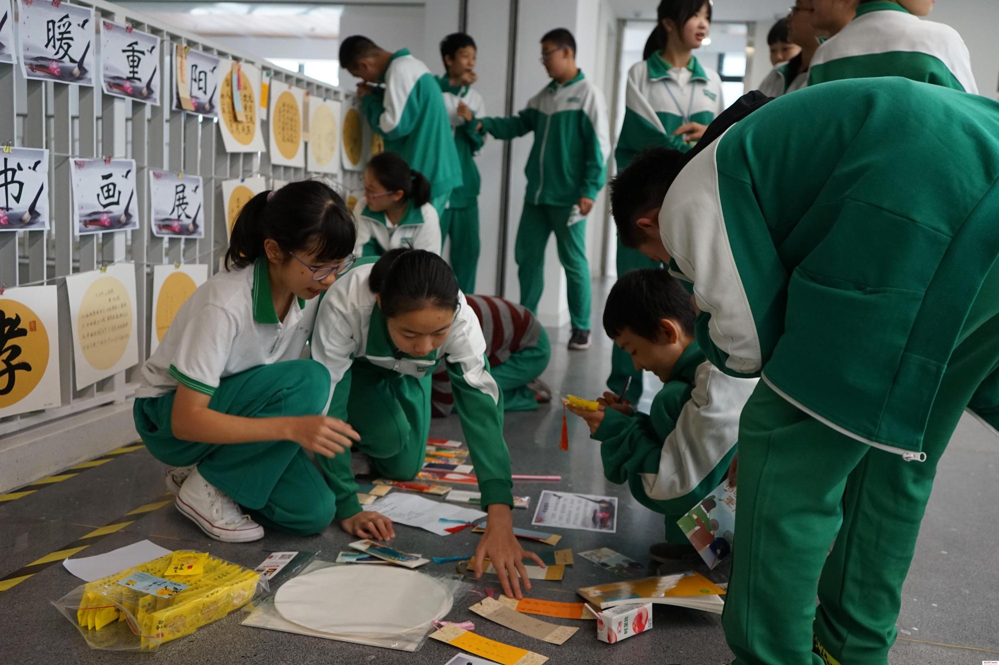 中午12点40分许,学校一层大堂里,准时响起了同学们朗诵重阳节诗词的声音。伴随着余音绕梁的乐音,本次重阳节主题活动拉开了序幕。 同学们各就各位,有的拿出香包,有的掏出纪念卡,还有的张贴告示…… 不一会儿,穿着红色校服的初一学弟学妹们眼中充满着好奇,围在香包桌边。我们班的同学们耐心地给他们讲解着,细心告诉他们,香包的制作过程。我想这些小同学听了我们学长学姐的介绍后,一定会对中国传统文化产生浓厚的兴趣! 要说这次活动中最受欢迎的活动组,那必须是重阳糕和菊花茶组啦!一杯杯菊花茶摆成一排,转眼间,只剩下一堆空杯子;口感黏软、酸甜结合的重阳糕,转眼间进了同学们的嘴里……无论是刚入学不久的初一学弟学妹,还是与我们同级的初二同学,以及初三的学长学姐,都聚在一起讨论着这些传统美食的别样滋味,脸上写着惊喜和喜悦。是啊,我们常常由于学业的繁忙或是现代的生活,忽略了中华博大精深的传统文化的独到之美。 “同学来看看垃圾分类吗?……”配合这次活动的还有我们优秀的垃圾分类组。现在国家要打造绿色生态文明,自从上海垃圾分类系统正式投入使用后,有不少公民不知何为干垃圾、湿垃圾……所以这一新兴话题引来了许许多多的师生的兴趣,纷纷前来参与,答对就会有纪念明信片。不少同学手里攥着好多张“战利品”,蹦蹦跳跳地去往下一个活动目的地。 众所周知,重阳节的几大习俗中,有登高饮酒。 作为未成年人无法饮酒,那我们就来“登高”吧。一层楼梯入口有三位同学手拿空白计分条,参与者从一层以最快速度爬到四层,即可兑换奖品。在我们青少年看来,这既是践行中华传统文化的多彩习俗,又是锻炼体能的好方法!