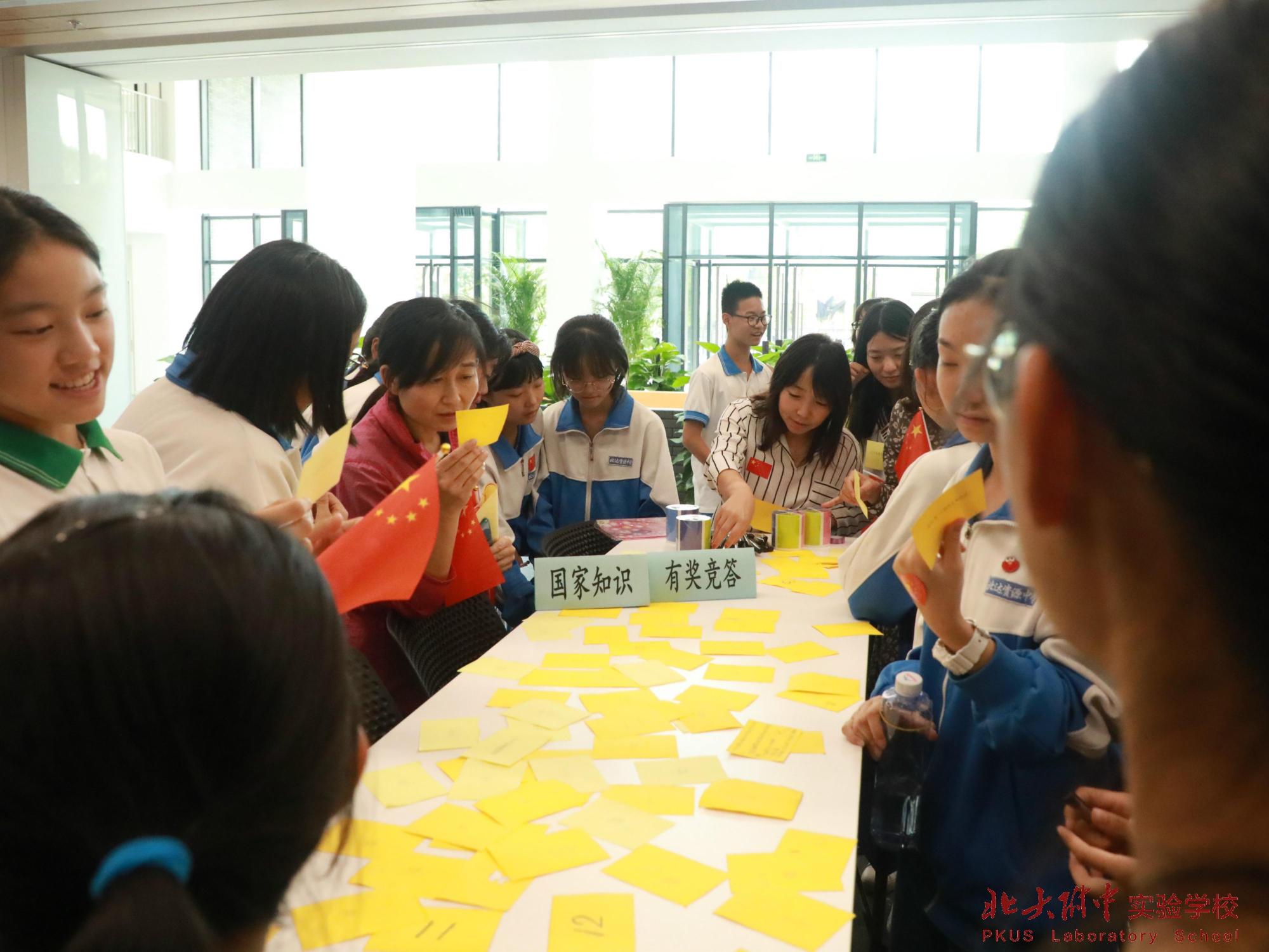 有奖竞答活动的答题桌被同学们围得水泄不通,他们争先恐后地排队答题,一起回顾祖国70年来取得的伟大成就,为祖国的繁荣富强点赞。答对问题的同学骄傲地拿着自己赢得的奖品,迟迟不肯离开。