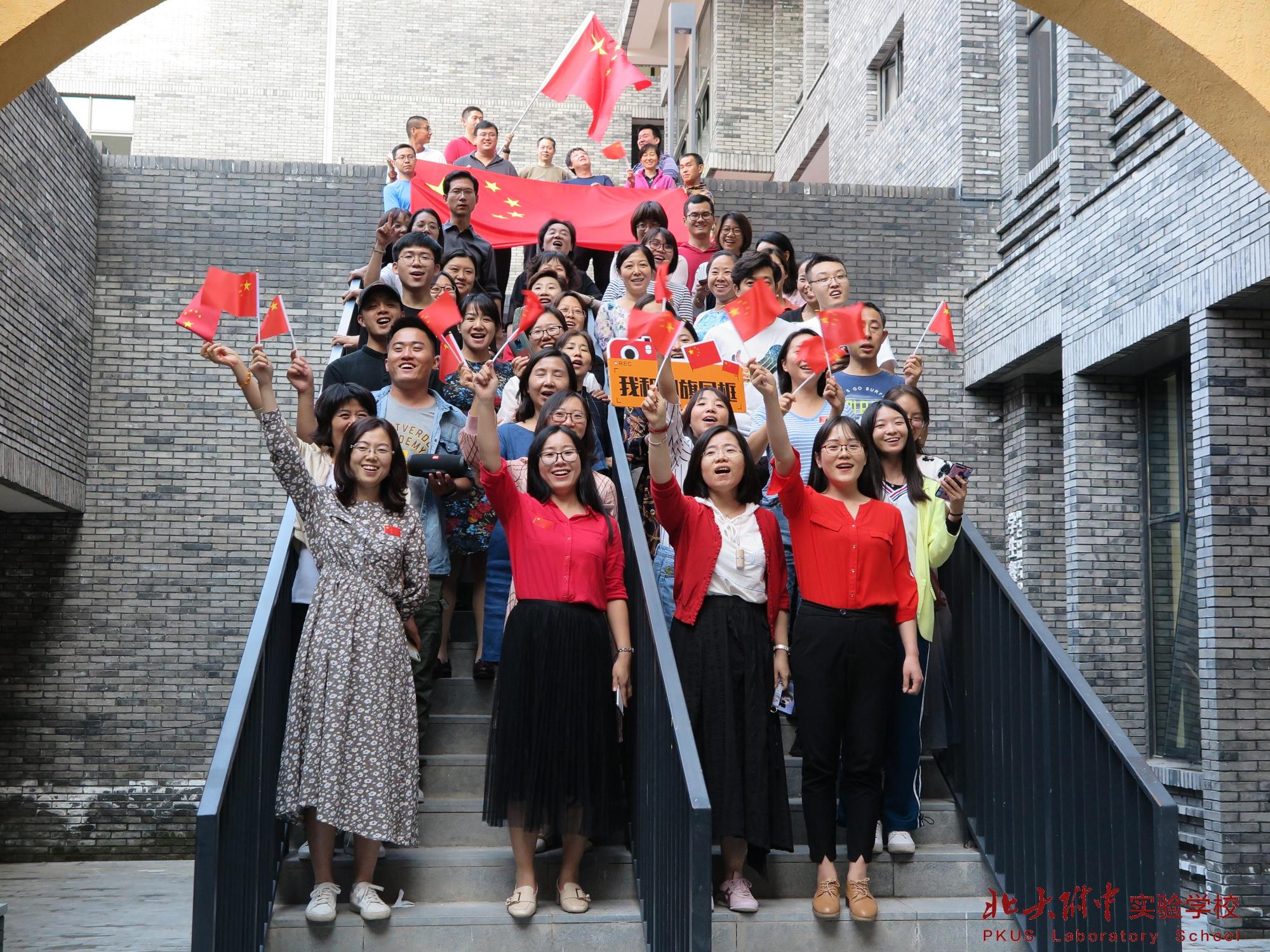教师团队接力快闪,祝福祖国。下午,忙碌了一天的老师们在送走学生后,自发地汇聚在校园一角,在陈伟聪校长的带领下,大家挥舞着国旗,伴随着《我和我的祖国》的优美旋律,齐声合唱,激情嘹亮的歌声响彻校园上空。