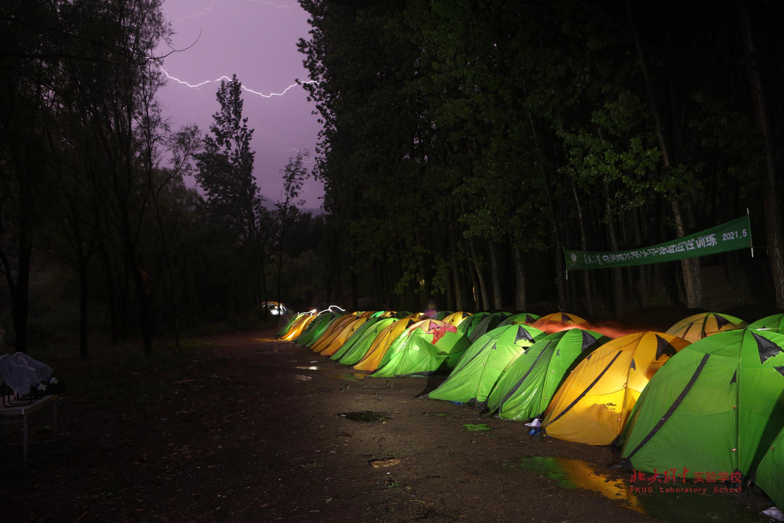 神奇的大自然总是带给我们惊喜。一场突如其来的雷阵雨,给我们的露营添了调料。帐篷外雷声滚滚、落雨如珠,帐篷里灯影婆娑、言笑晏晏。听说没有什么温馨常伴,只是有人替你负重向前。揭开帐篷的卷帘,雷雨中是老师们手持手电筒为我们巡夜的身影,手电筒的灯光打在帐篷上,映衬着雨珠滑落,送我们进入梦乡。