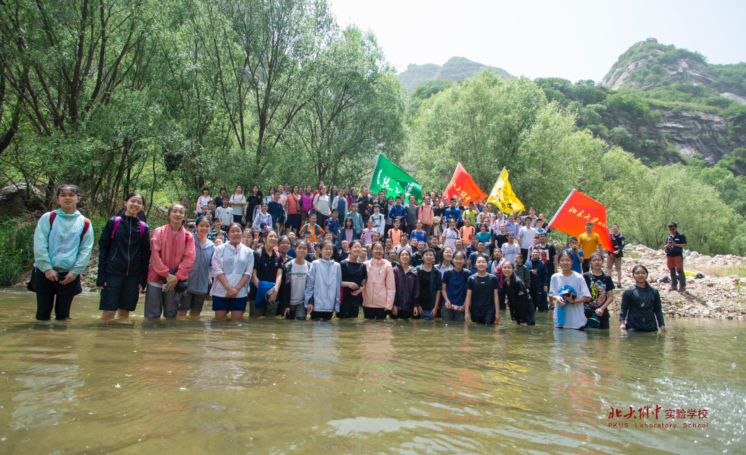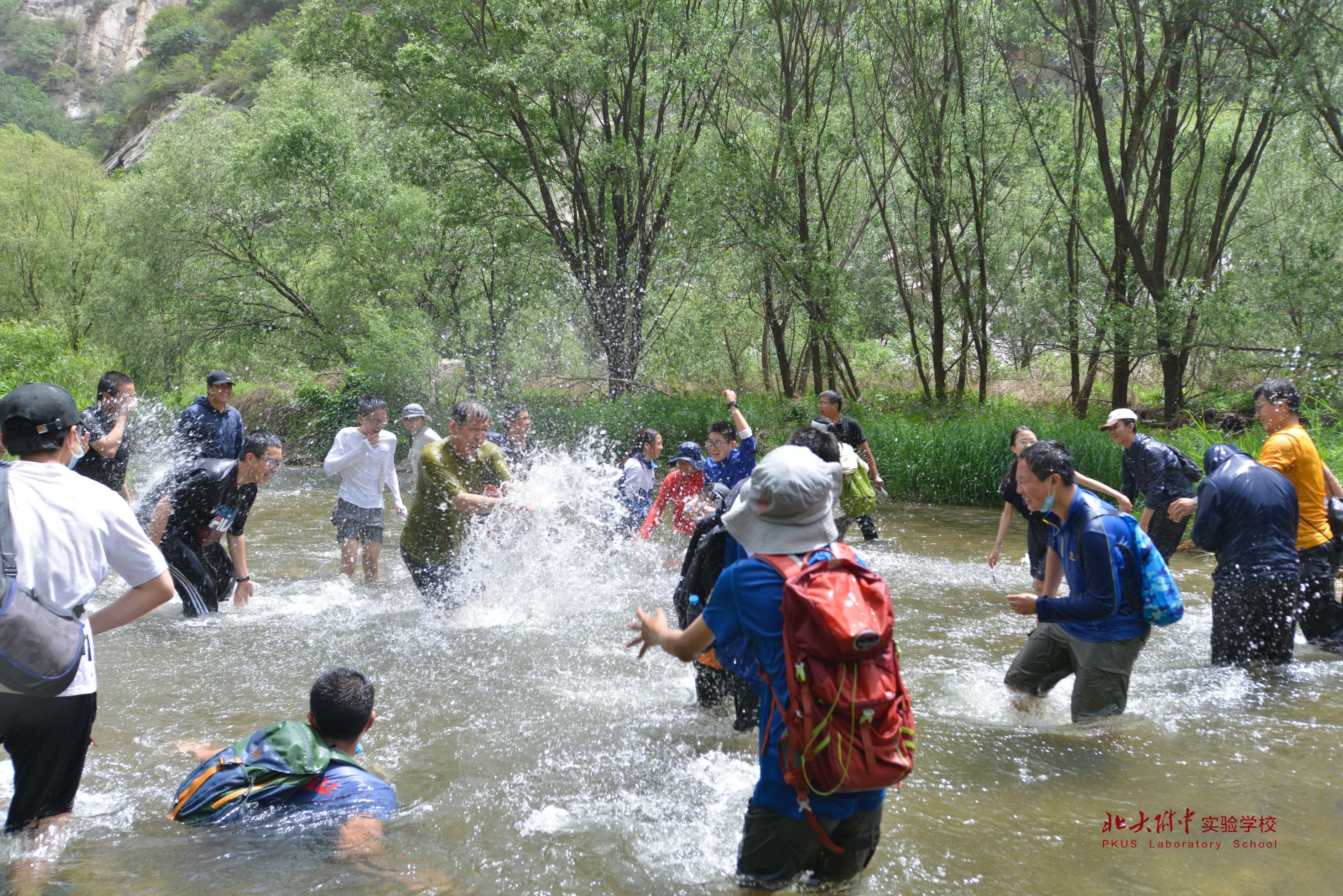白河,白河,到了白河,怎能不下水畅快一下?初二的学长学姐们利落地换好溯溪鞋,挽起裤腿,拿着锅碗瓢盆就下了河。拿锅碗瓢盆是要去捉鱼吗?我们这些初一的虽然不解,但也不敢耽误,紧随其后地冲进水里。此时我们还不知道,就在五分钟之后,我们会加入一场泼水大混战,手持“兵器”的初二学长学姐们将大获全胜,老师们则是他们的“帮凶”,而我们就这样经过了自然之翼的欢迎仪式,成为了一个自然之翼人。