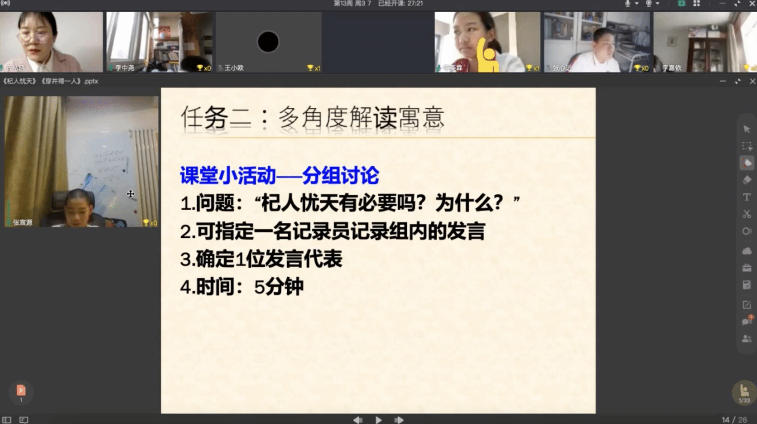 第六单元的大单元主题是“想象与思辨”,本节课是在大单元主题下结合寓言的特点进行的设计,主要通过鼓励学生积极展开联想,进行发散思维,尝试从多个角度解读寓意。课程亮点上,从学生熟悉的《杞人忧天》入手,通过分组讨论的方式让学生围绕问题“杞人忧天有必要吗?为什么?”来解读寓意。活动中学生各抒己见、讨论争辩、发散思维,多角度解读寓意。对于学生解读不到的寓意,老师搭建学习支架,出示补充资料,引导学生发散思维,读出新的寓意。最后总结多角度解读寓意的方法,引导学生用这个方法解读《穿井得一人》的寓意。