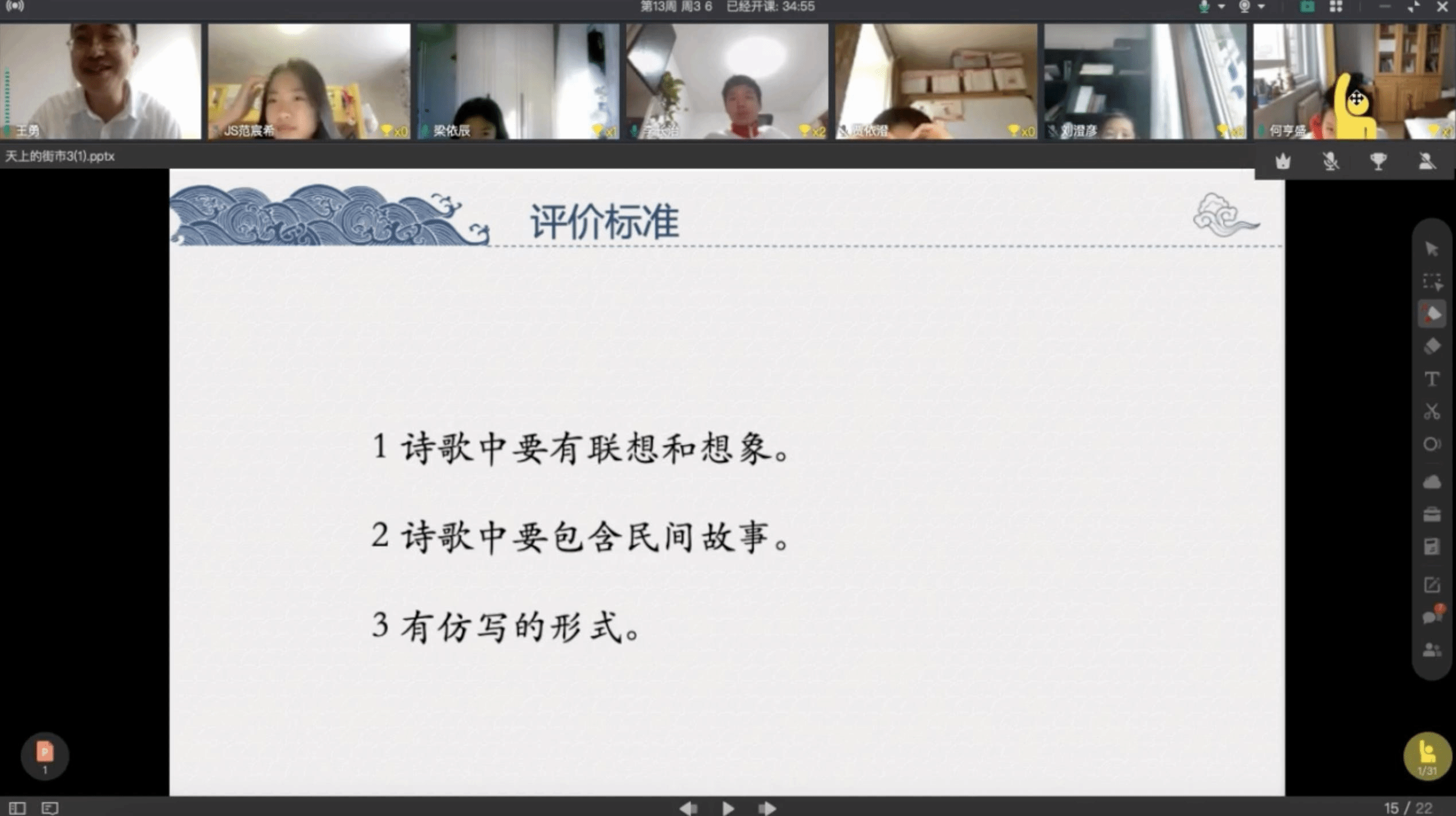 散文单元教学的主题抓的非常准,张鹏老师用朗读的方式来推动整个教学内容,过程中一步步引导学生从对事物的把握到理解作者的写作意图,到深刻体会作者情感,非常有层次,有章法。设置“抗战朗诵会”的情景导入,让学生更好的了解作者的情感、人物情感。巧妙构思,撬动全文。课堂设计很好的完成了读出散文中的“我”。虽然是线上教学,但张鹏老师设计完善、考虑充分,教学过程流畅,和学生互动、启发,课堂参与度极高。最后的环节特别有深度,这正是大单元教学的可贵之处。同时,张老师很有亲和力,她富有激情的朗诵让学生们入境很快,对线上教学的效果起到了很好的作用。