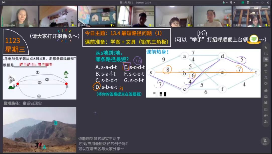 王雪老师将最短路径问题通过线上课的方式呈现。课前设计选取最短路线的数学游戏富有趣味性的引入课堂主题。发答题器根据学生实时数据统计进行分析讲解;发小黑板让每个学生独立思考画图感知最佳方案;随机选人进行课题阅读分析、抽象提炼等。不仅充分调动激发了学生参与思考的积极性,更实现了教学评一体化的目标。