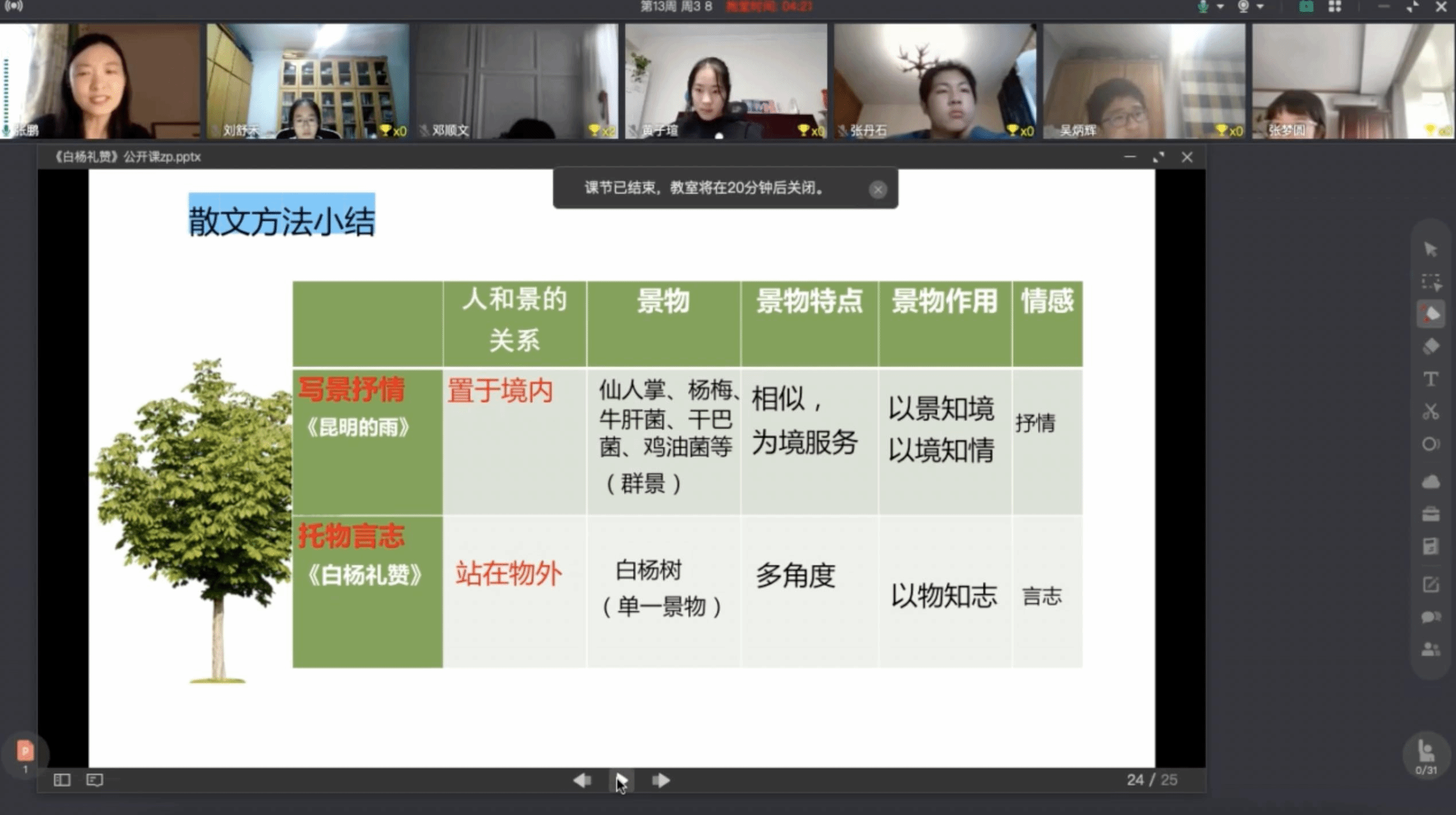 第三单元的内容是不同类型散文,本身具有较高的文学价值。基于大单元教学的思路,备课组将这一单元的问题聚焦在“寻找散文中的‘我’ ”。《白杨礼赞》这篇文章是一篇老课文,并且背景是抗战时期。为了更好的解读文本,学生理解文章结构框架以及文章写作背景是学习课文的关键。本次研究课也有几点创新之处。其一,为了让学生明白作者的写作意图,创设情景以“小战士”的视角,开展抗战朗诵会。这是形式上的创新,也更能让学生有代入感。其二,基于大单元教学,学生用写景抒情散文《昆明的雨》的学习方法,即以文知景——以景知境——以境知情——以情知人,通过以文知人,让学生更好的读懂作者;学习托物言志类散文《白杨礼赞》,以“以文知景—以景知情—以情知人”来推进。最后,梳理出学习这两类散文的学习方法,读出散文中独特的“我”。
