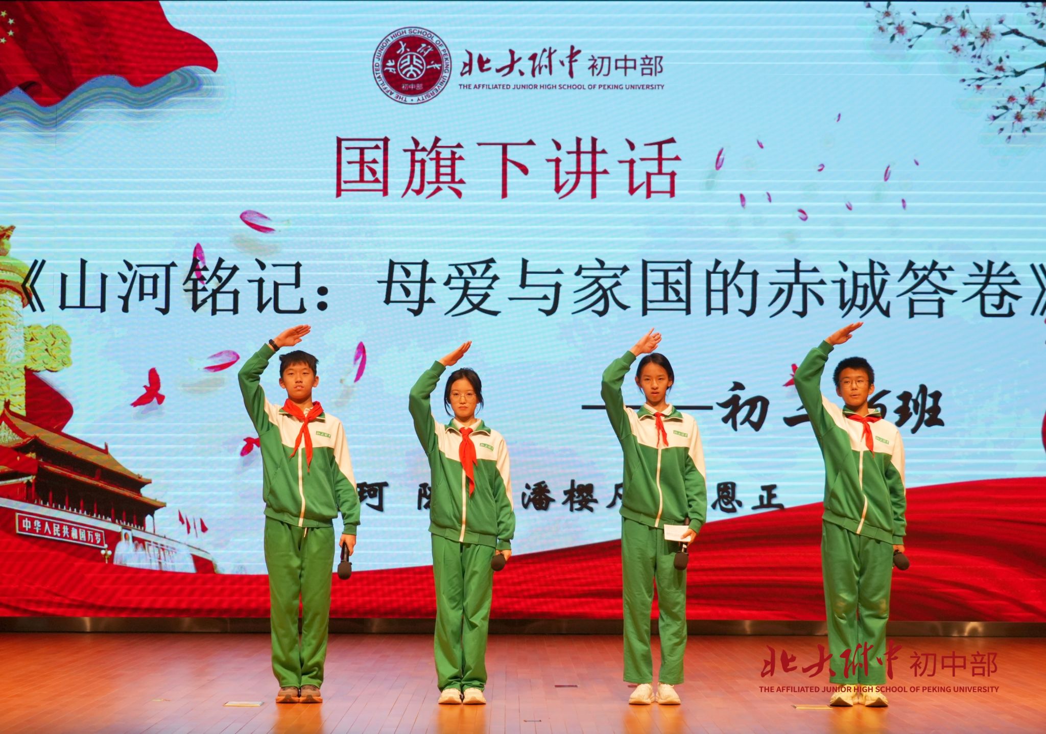 本周国旗下讲话是由陈昱、夏艺珂、潘樱凡和苏恩正同学带来的演讲《山河铭记:母爱与家国的赤诚答卷》。