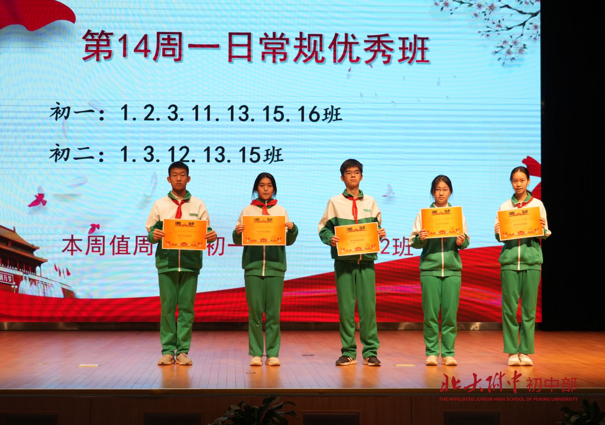 担任本周升旗仪式的班级是初二13班。初二13班是一个满溢朝气、凝聚温情、奋进不止的班集体。我们始终怀揣对师长的敬重之心,秉持互助互爱的相处之道,严守校规班纪,让“团结、严肃、活泼”的氛围成为班级最鲜明的底色。初二13班累计19次斩获常规评比优胜班称号。课堂上,我们专注凝神、勤思善问,在知识的海洋中奋勇争先;操场上,我们挥洒汗水、永不言弃。在2025年海淀区班级篮球联赛中,同学们默契配合,奋勇拼搏,最终摘得海淀区亚军殊荣,用热血与汗水为班级荣誉簿再添浓墨重彩的一笔。