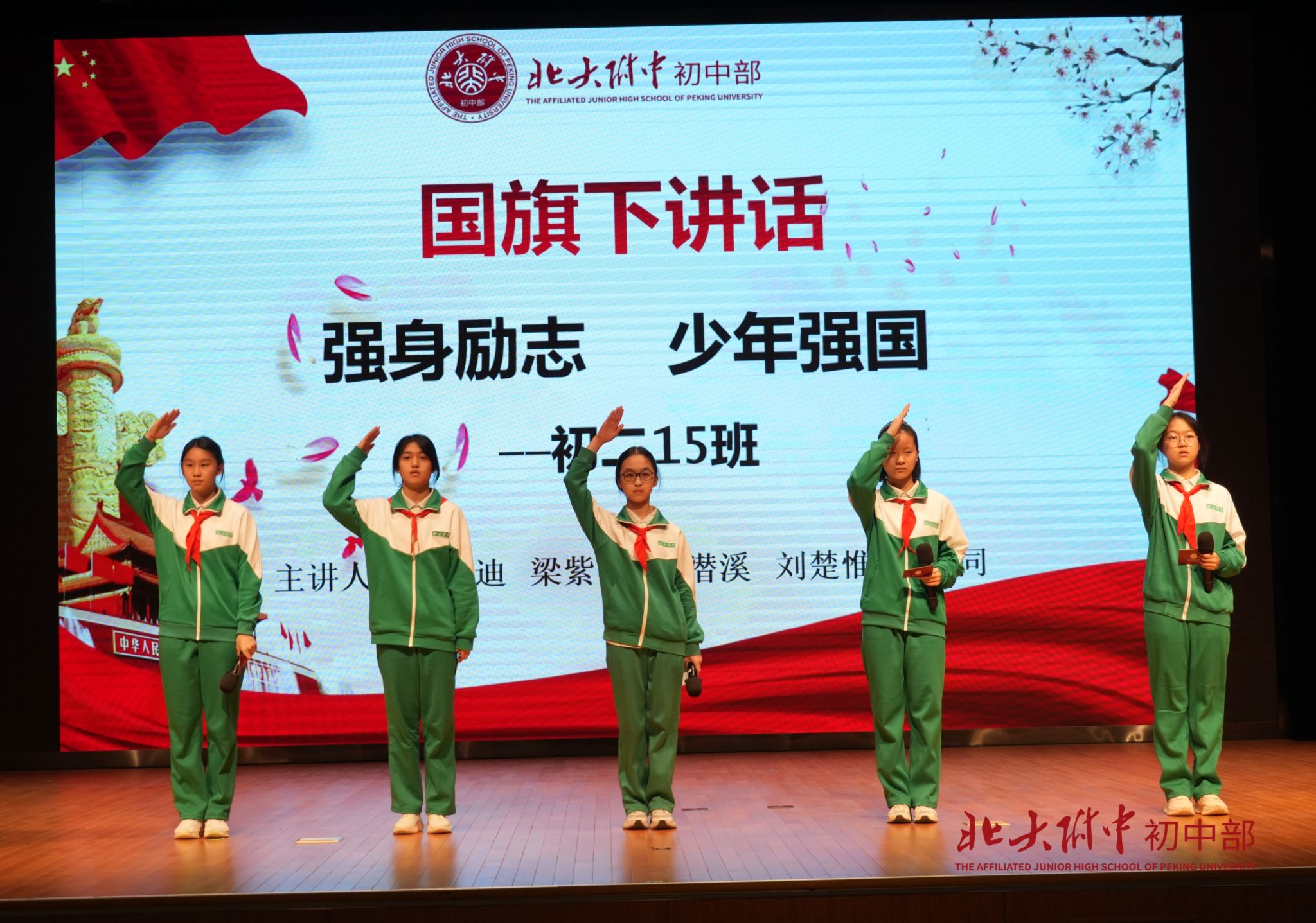 本周国旗下讲话是由冯兰迪、梁紫涵、盛潜溪、刘楚惟和苑雨同同学带来的演讲《强身励志 少年强国》。
