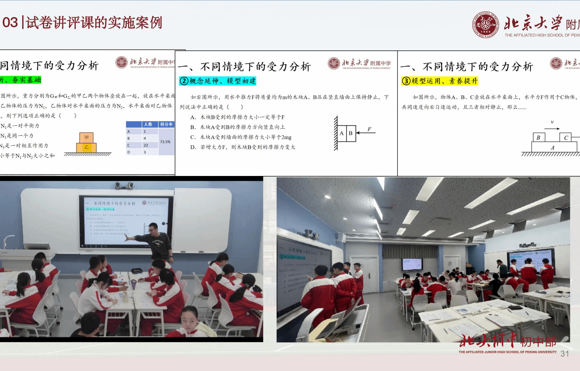 何艳阳老师基于新课标理念和物理学科试卷讲评遇到的问题,从文献综述引入,梳理了讲评课的现状、问题,并明确了落实讲评课效果的若干原则。何老师强调教师要把握试卷讲评的时效和实效,从数据分析和作答情况入手,精准把握学生答题问题背后的原因,在此基础上,根据各班个性化特点设计试卷讲评流程,将讲评课的核心任务——发现问题、解决问题的主动权交给学生,让学生的思考、讨论贯穿讲评课。