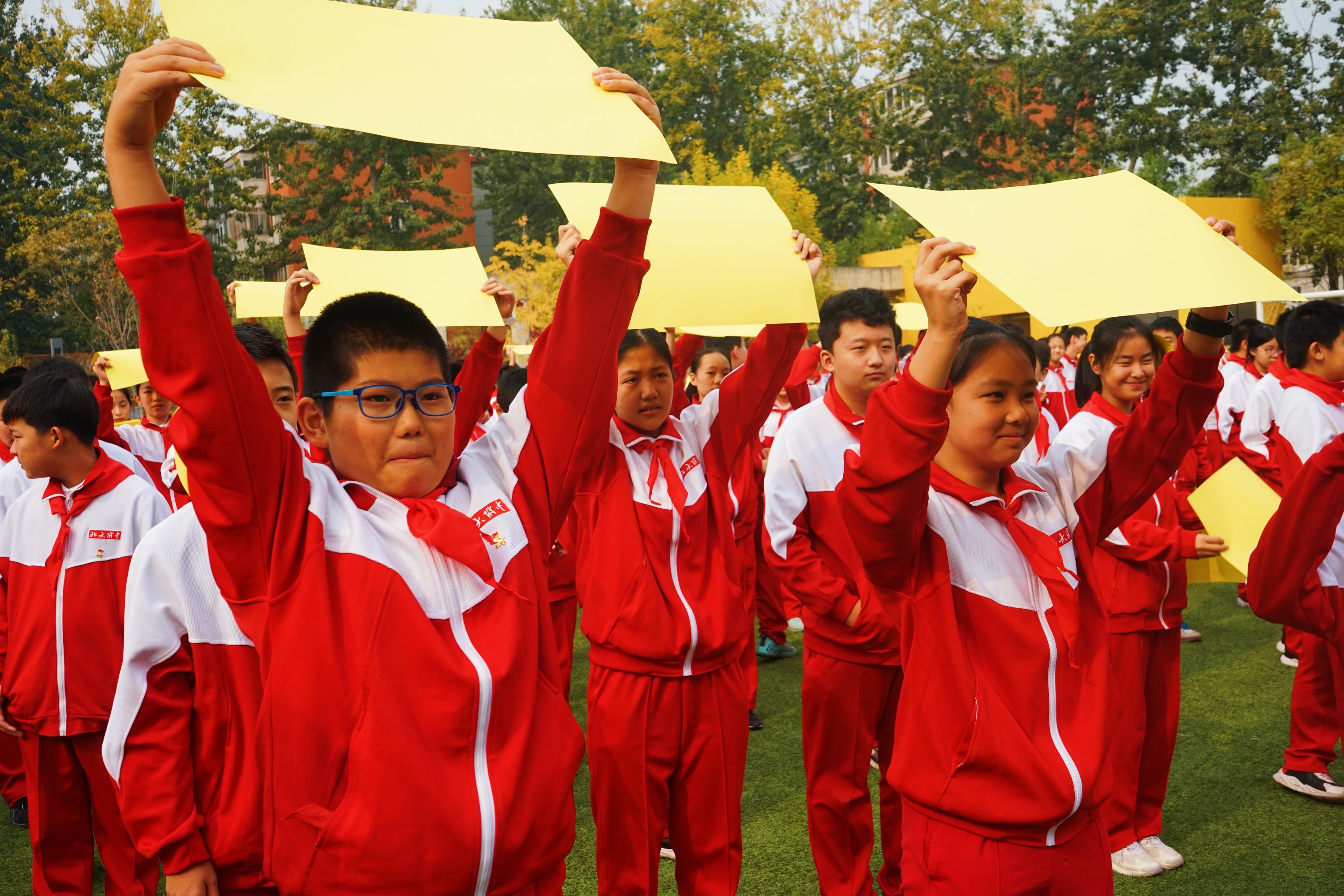同学们高高举起手中的“我爱中国”,决心坚定理想信念,牢记报国之志,用实际行动为胸前的红领巾增光添彩。