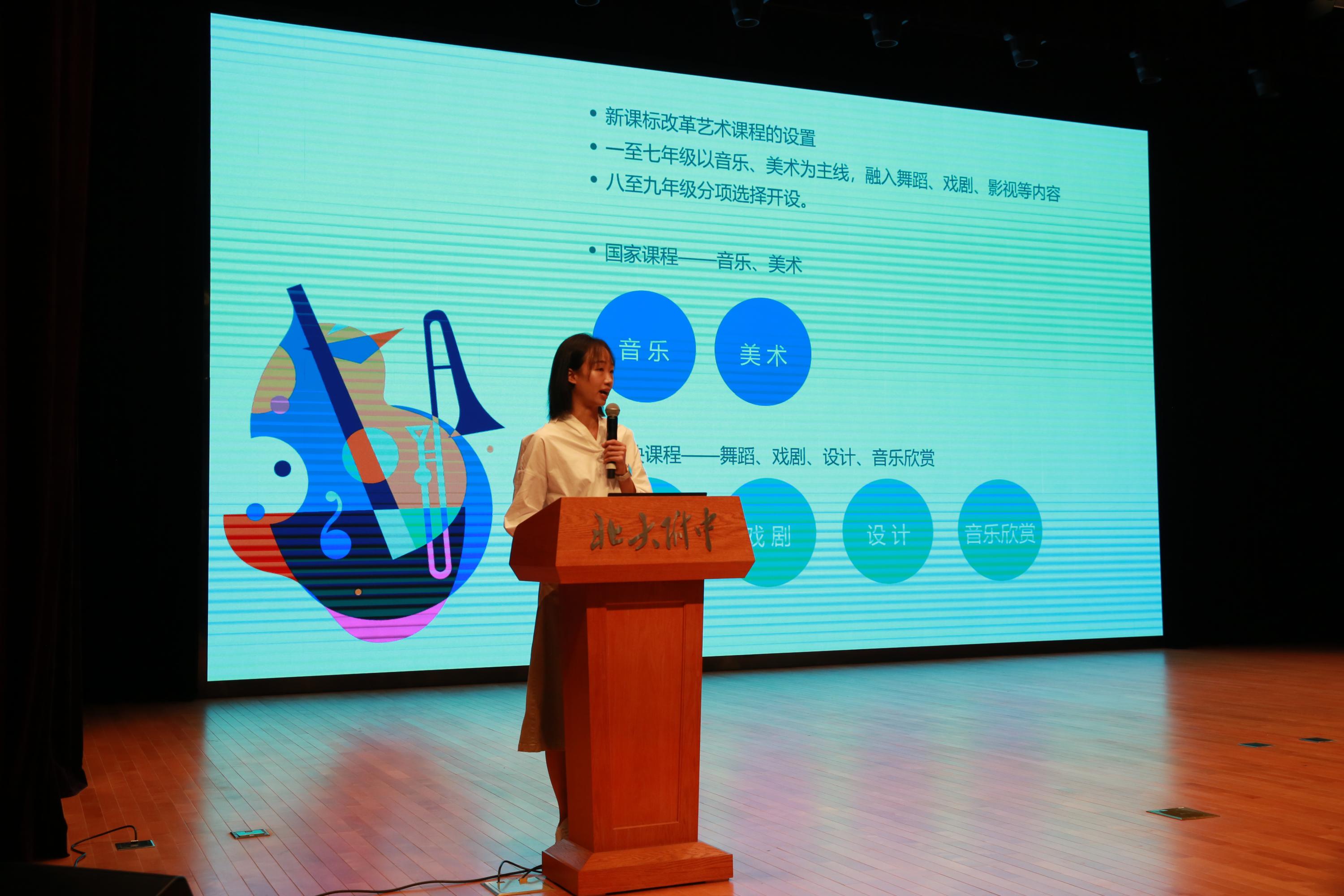 艺术学科组代表教师纪靓做了主题为《初中艺术课程体系与教学规划》的汇报,展示了艺术组基于新课标的新学期教学规划,艺术课在原有国家课程(音乐、美术)的基础上,增设了丰富多彩的模块课程(舞蹈、戏剧、设计、音乐欣赏)。从艺术课程的宽度、深度、广度三个维度探究了艺术课程的整体建设,突出学生为主体,教师为辅,重视学生的体验感和个性创造;探索基于学科的课程综合化教学,开展研究型、项目化、合作式学习。艺术课程将秉持着坚持以美育人,重视艺术体验,突出课程综合的理念,培养学生的审美感知、艺术表现、创意实践,文化理解。