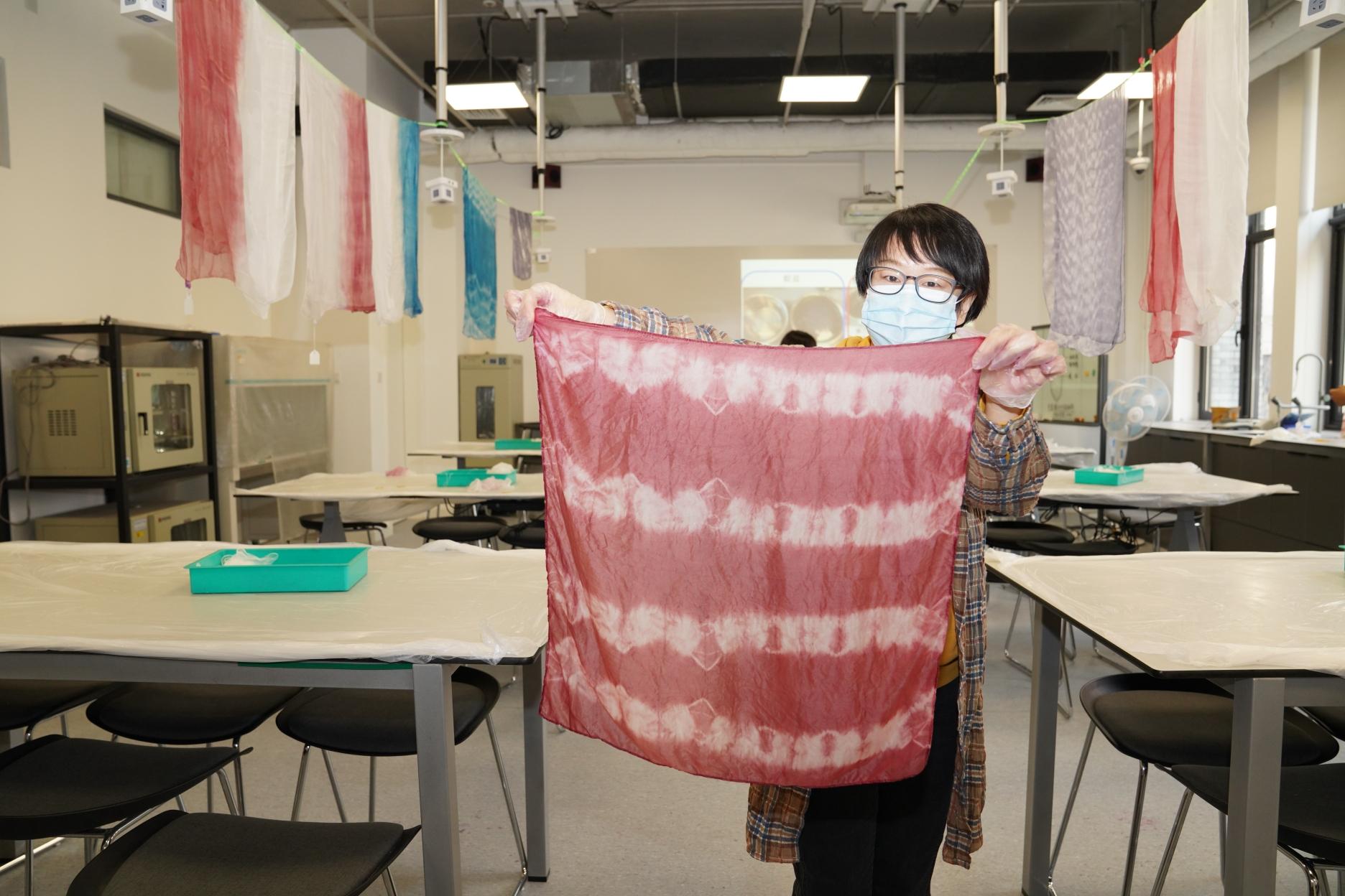 染好后,老师们将自己的作品清洗、展示,大家都惊叹自己的作品如此独特,有的老师设计的是经典扎染圆环形图案,有的老师设计的是条纹图案,有的则是渐变图案,还有的老师用鱼鳞纹技法,搭配梦幻紫的色彩,显得格外美丽。