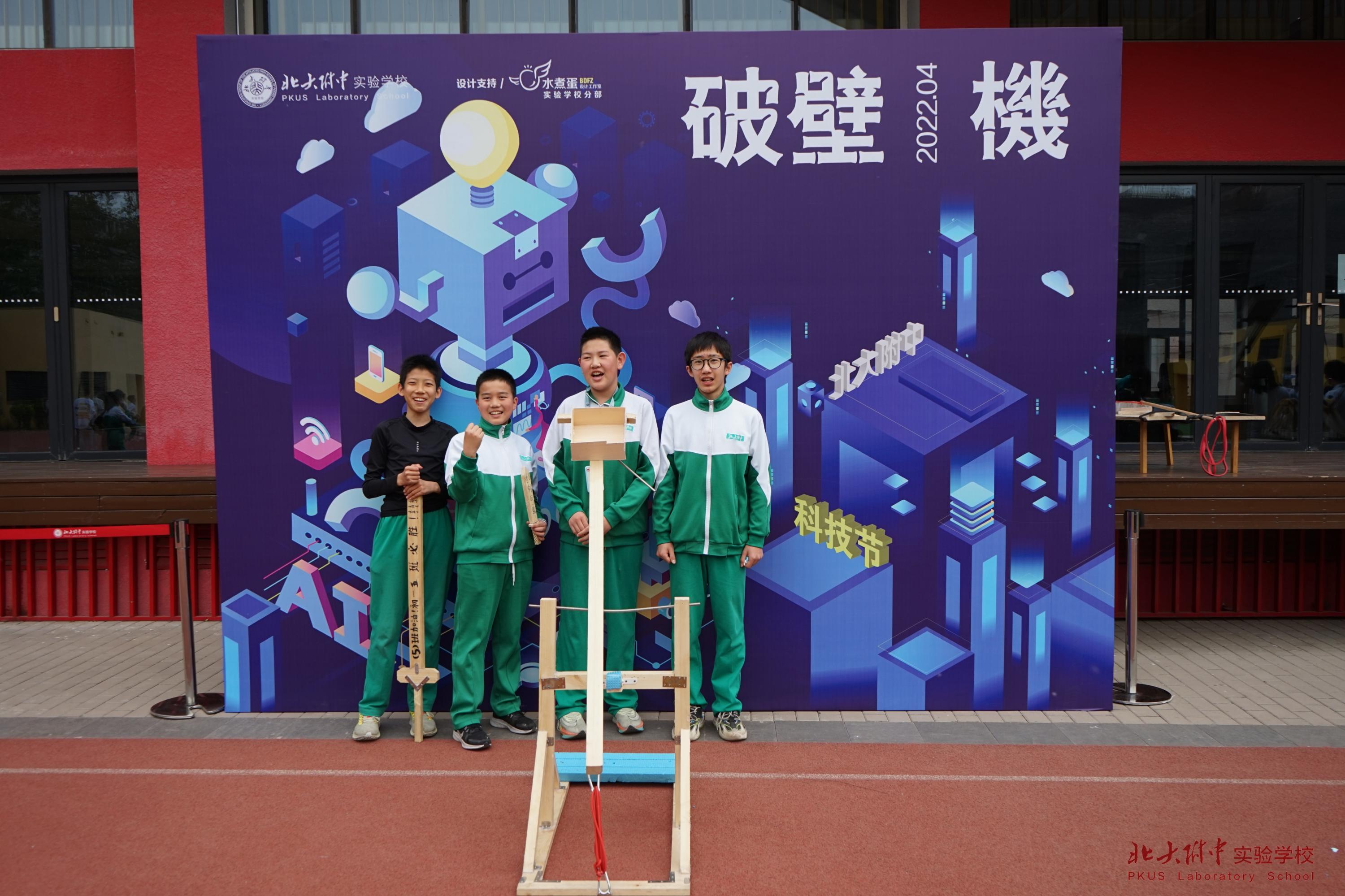 本次科技节的主题是“破壁·机”,寓意攻破壁垒,抓住机遇,迎难而上。开幕式现场,各班的投石机瞬间吸引了同学们的眼球。