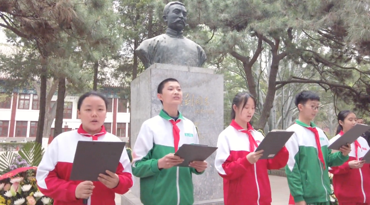 松柏青翠,歌声回荡。少先队员献唱《我们是共产主义接班人》,师生缓缓走近李大钊同志塑像,敬献花篮。