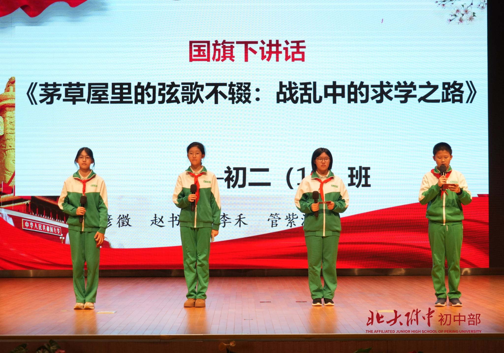 本周国旗下讲话是由李彦徵、赵书瑶、李禾和管紫涵同学带来的演讲《茅草屋里的弦歌不辍:战乱中的求学之路》。