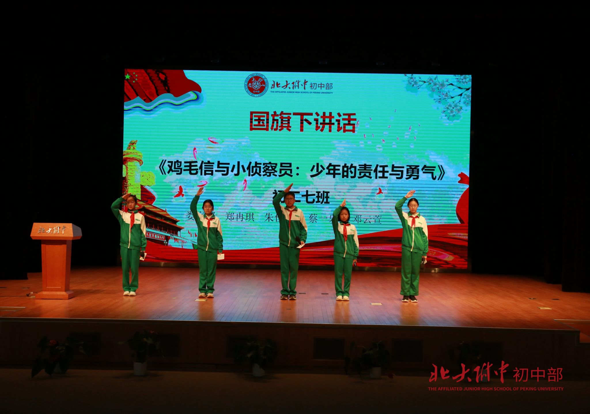 本周国旗下讲话是由娄家郡、郑冉琪、朱佳玥、蔡一乐和邓云萱同学带来的演讲《鸡毛信与小侦察员:少年的责任与勇气》。