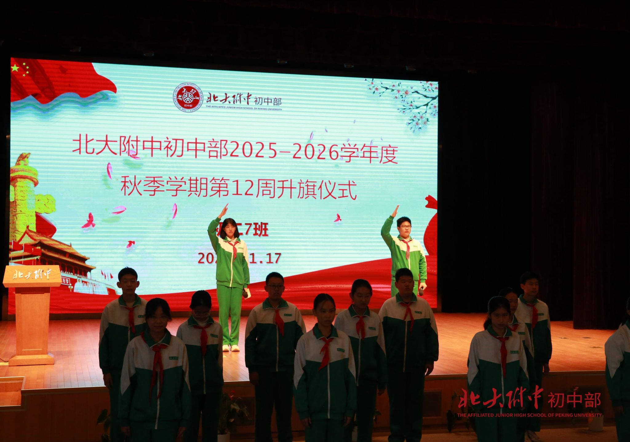 2025年11月17日上午8时,2025-2026学年度秋季学期第12周升旗仪式在畅春园校区礼堂举行。