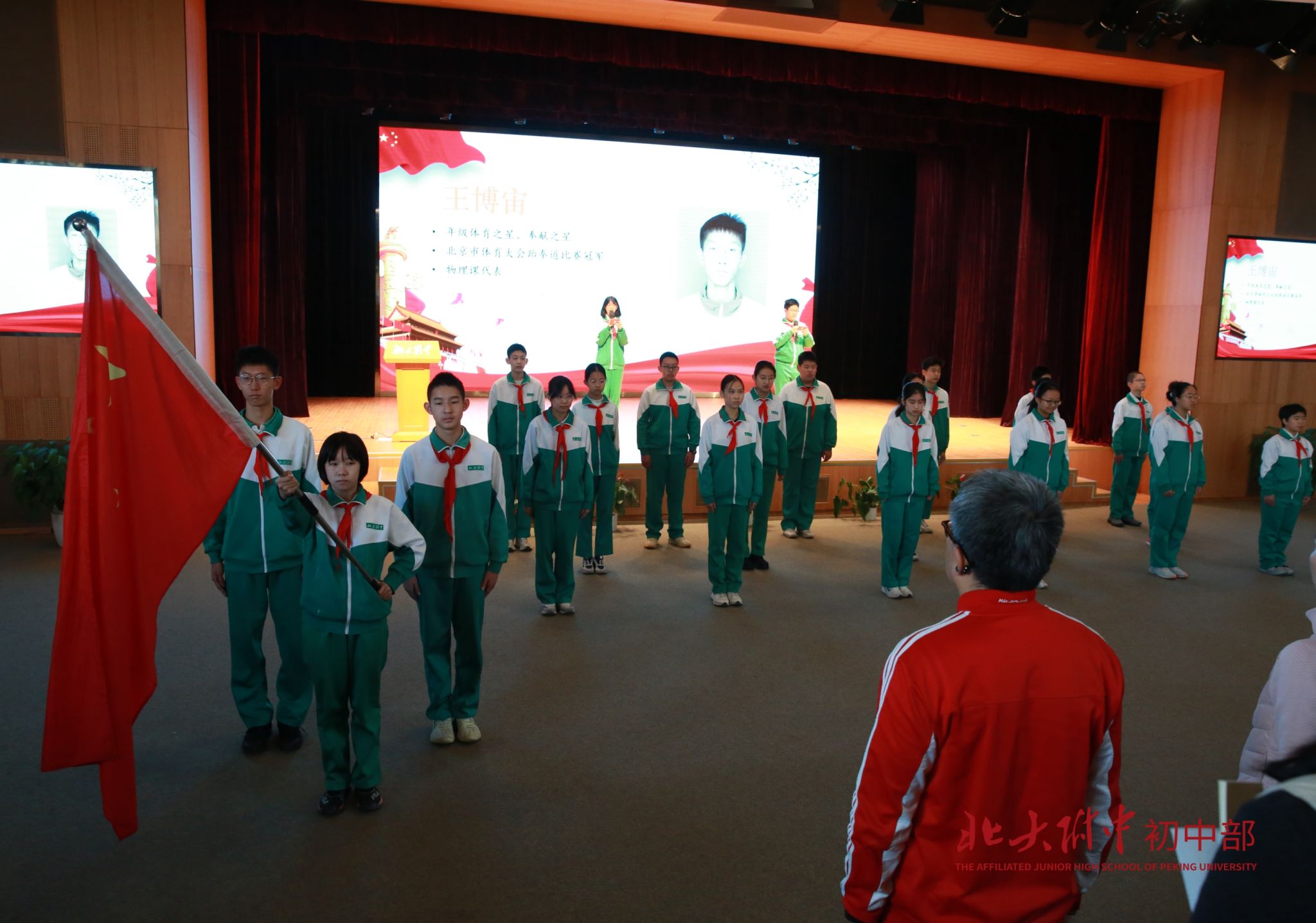 护旗手王博宙同学,他担任初二七班物理课代表。他擅长体育,曾获年级体育之星,北京市体育大会跆拳道比赛冠军。